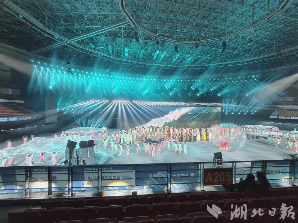 开幕式如何璀璨绽放?10月23日晚,湖北日报全媒记者走进武汉体育中心体育馆,近千名演员在声光电技术配合下进行全流程彩排。